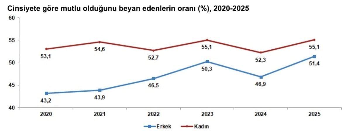 Mutlu olduğunu beyan eden erkeklerin oranı, 2024 yılında yüzde 46,9 iken 2025 yılında yüzde 51,4 oldu. Kadınlarda ise bu oran, 2024 yılında yüzde 52,3 iken 2025 yılında yüzde 55,1 oldu.